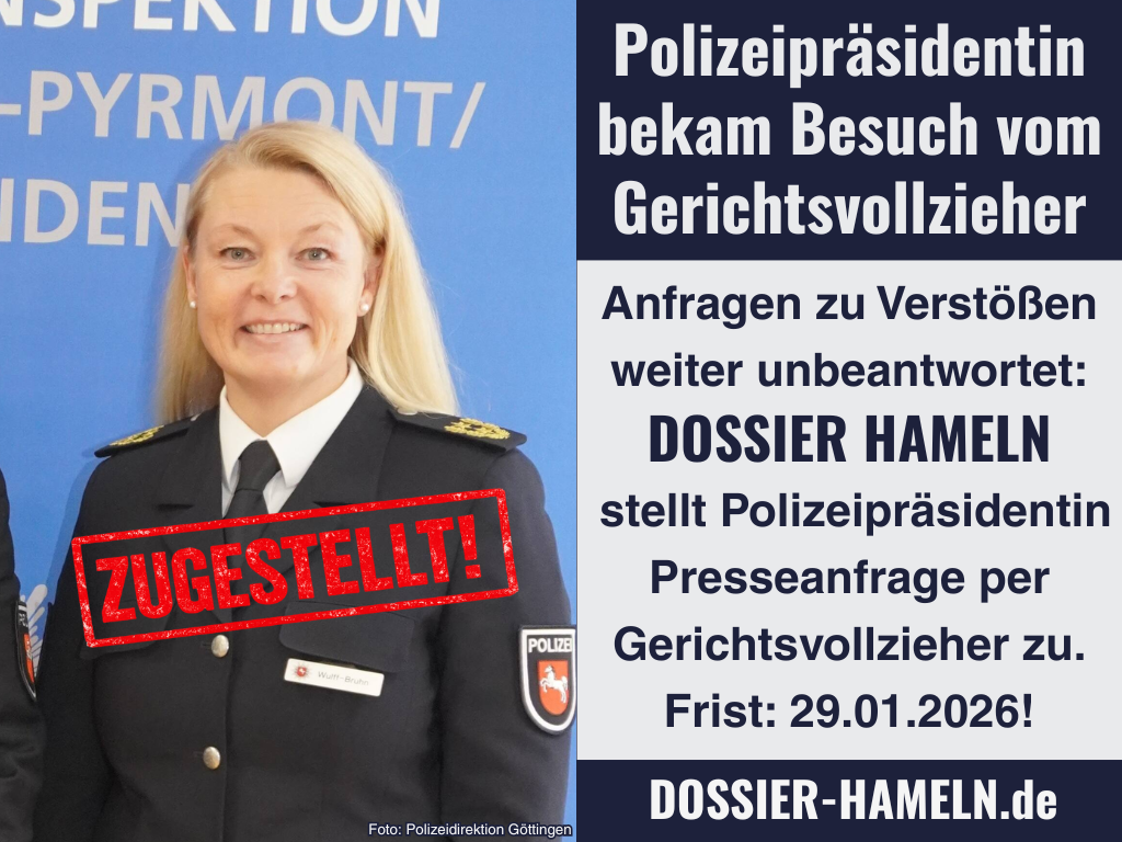 Am 22. Januar 2026 beantragte die Dossier Hameln Verlagsgesellschaft mbH beim Amtsgericht Göttingen die Zustellung einer Presseanfrage per Gerichtsvollzieher – persönlich an Polizeipräsidentin Tanja Wulff-Bruhn. Die Anfrage umfasste 15 Seiten einschließlich Anlagen: das Gutachten von Prof. Erb, den DJV-Presseausweis und die fotografische Dokumentation der Observation journalistischer Tätigkeit.