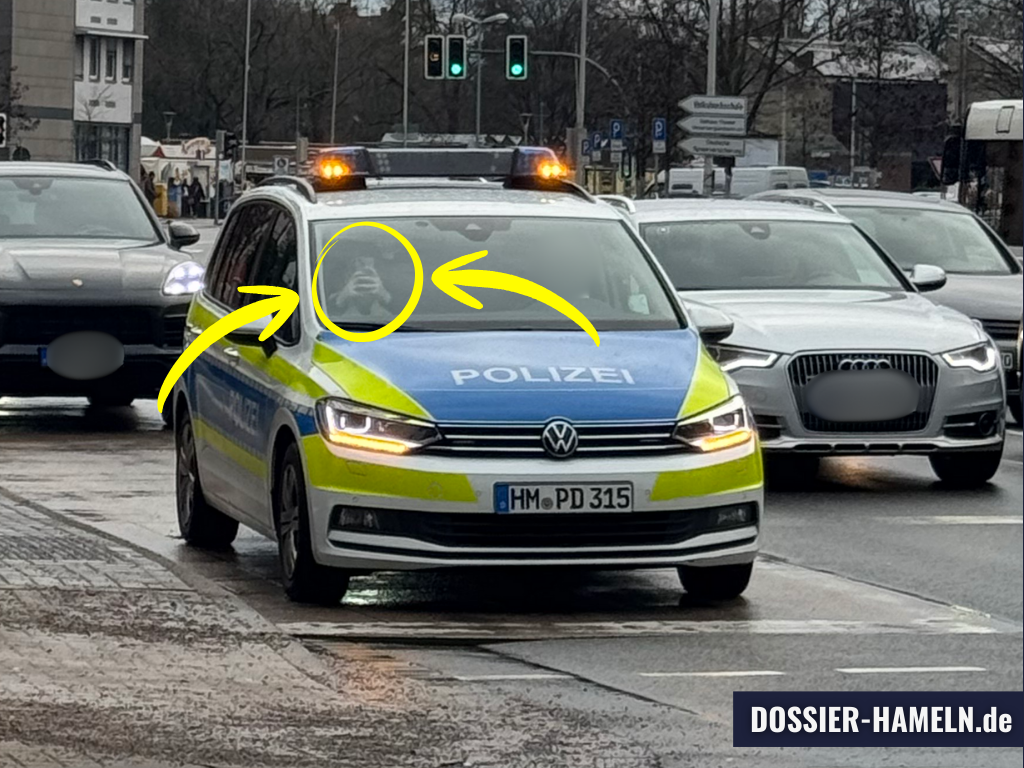 Mindestens an 13 dokumentierten Tagen zwischen dem 30. Dezember 2025 und dem 20. Januar 2026 positionierten Beamte der Polizeiinspektion Hameln-Pyrmont/Holzminden Streifenfahrzeuge am Kastanienwall, um die dortige LED-Tafel mit der Berichterstattung von Dossier Hameln zu fotografieren und zu dokumentieren. Die vorliegenden Bilder zeigen Polizeifahrzeuge mit Hamelner Kennzeichen (HM-PD 315, HM-PD 325 u.a.) zu folgenden Zeiten: 6. Januar 11:44 Uhr, 8. Januar 10:41 Uhr, 9. Januar 8:27 Uhr, 11. Januar 21:40 Uhr, 13. Januar 11:33 Uhr und 14:00 Uhr, 14. Januar 11:32 Uhr und 13:31 Uhr – sowie an weiteren dokumentierten Tagen. Zwei Bilder belegen das Fotografieren durch Beamte aus dem Fahrzeug heraus direkt.